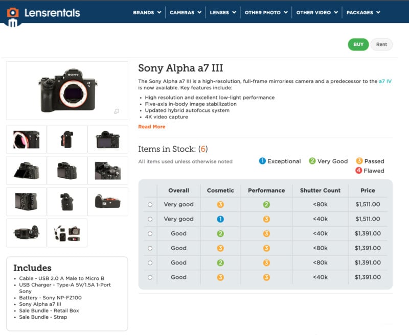 You can browse the LensRentals site as you normally would if you want to rent something, and if you’re interested in buying or seeing what’s available to buy, each product page has a “Buy” button in the top right. Clicking that will take you to a page that lists all of the available bodies/lenses for sale.